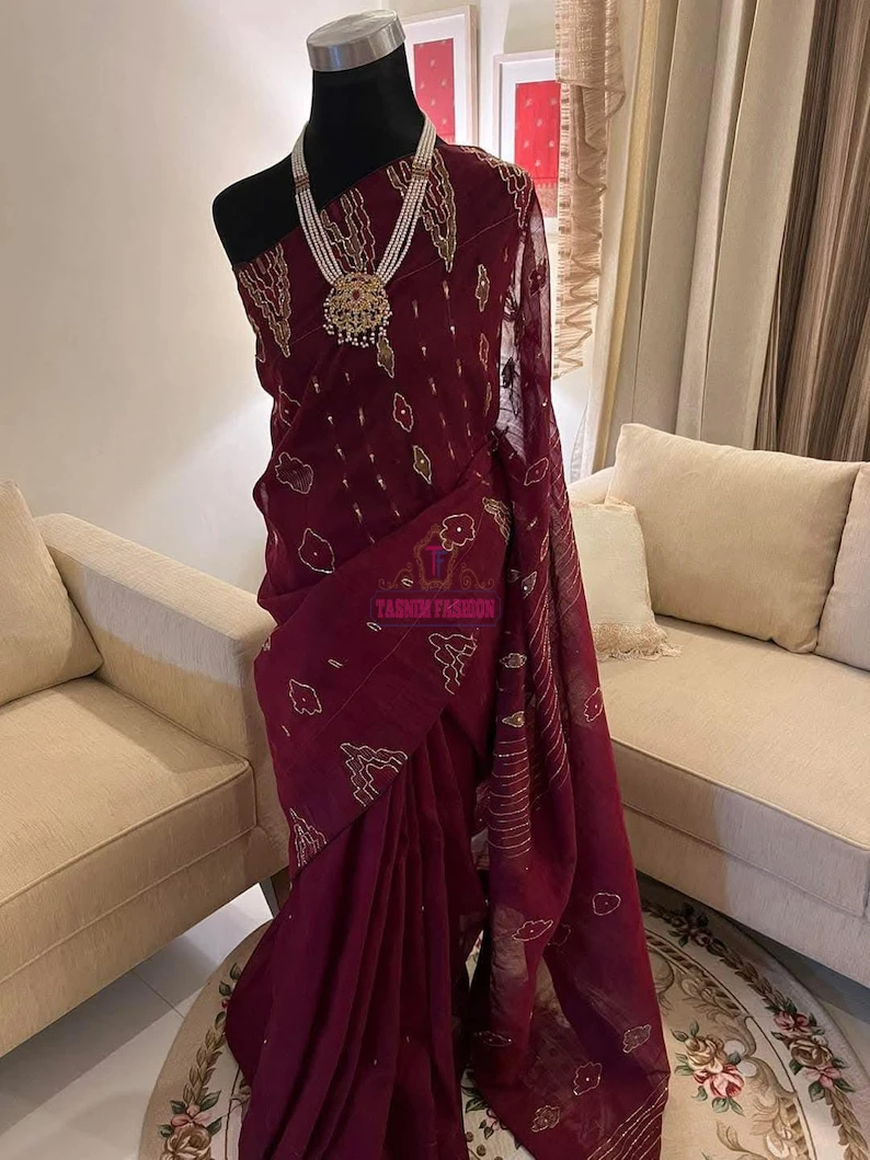 Fabric: Original Dhakai Jamdani party saree with karchupi work- Maroon